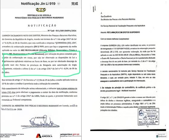 O Director do SNFPA volta a fazer das suas, em conluio com a Dra. Liliana do DIP, por conta de uma reclamação que os armadores do JIN LI, fizeram desta multa de 80 milhões de kwanzas, que resultou porque os chineses não queriam dar os 20 milhões de kwanzas, que o Dr.