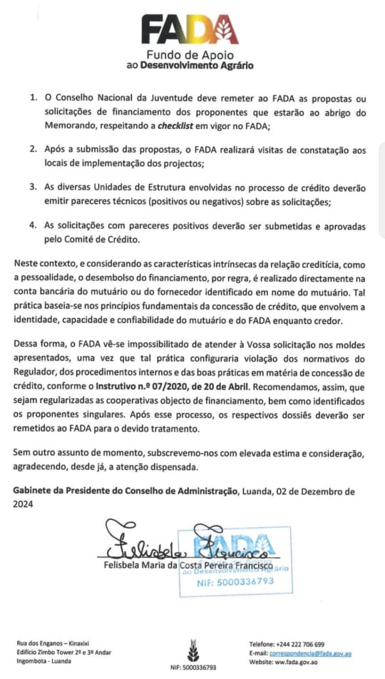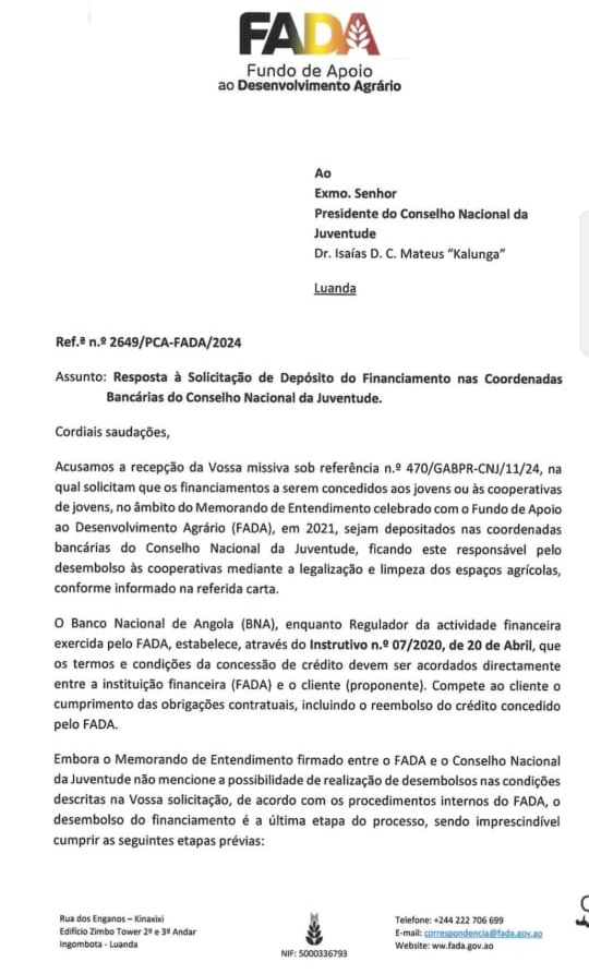 Um documento recentemente obtido expõe uma solicitação do responsável Isaías Kalunga ao Fundo de Apoio ao Desenvolvimento Agrário (FADA), no qual ele pede que todos os recursos provenientes de financiamentos destinados a jovens e cooperativas sejam depositados na conta do Conselho Nacional da Juventude (CNJ). Ele pretende, assim, assumir o controle direto desses fundos.