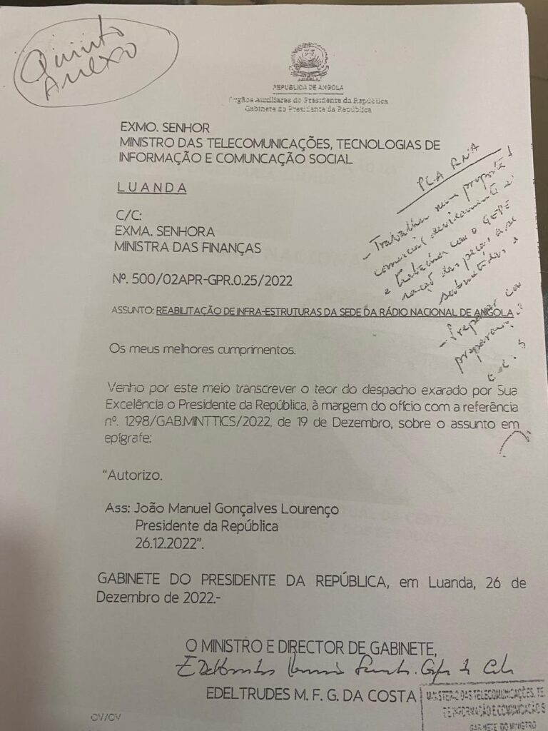 É neste contexto que surge a autorização assinada em dezembro de 2022 por Edeltrudes da Costa, enquanto director do Gabinete do Presidente da República, validando a libertação de fundos para a reabilitação da RNA.