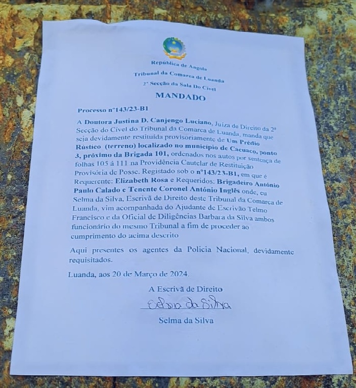 A execução da decisão judicial ocorreu no dia 20 de Março de 2024, com a presença de oficiais de justiça, nomeadamente a escrivã Selma da Silva, acompanhada por outros funcionários judiciais, bem como efectivos da Polícia Nacional, devidamente requisitados para garantir o cumprimento da ordem.