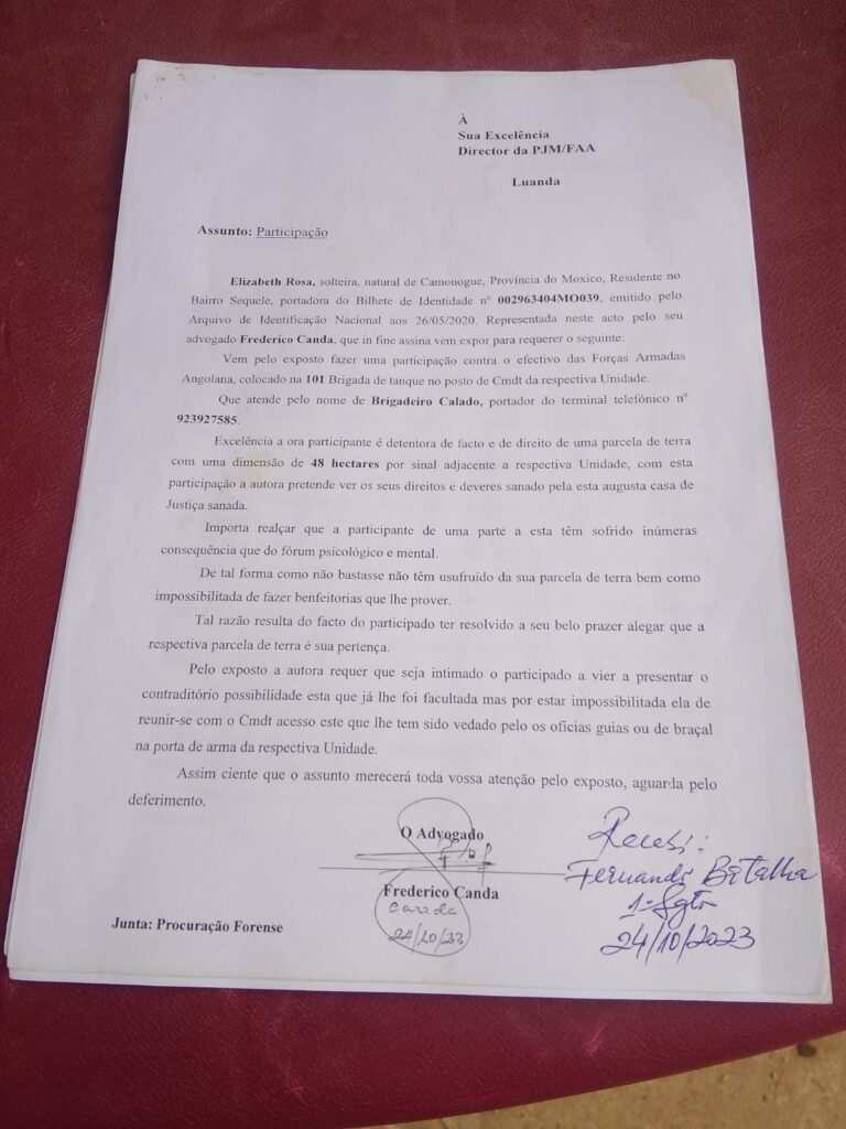 OFICIAL DAS FAA ANTONIO CALADO E DA POLÍCIA NACIONAL ACUSADOS DE TOMAREM DE ASSALTO TERRAS DA CIDADÃ ELIZABETH ROSA