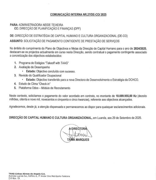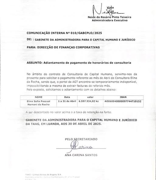 De acordo com as informações tornadas públicas, a administradora para a área de Capital Humano, Neide Teixeira, terá celebrado um contrato de prestação de serviços com a consultora Elina Rocha, avaliado em cerca de 6 milhões e 300 mil kwanzas mensais — montante que, segundo as mesmas fontes, ultrapassa a remuneração líquida da maioria dos directores da companhia.