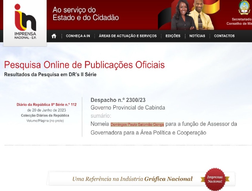 Com base nos registos oficiais, a 20 de Junho de 2023, a então “manda chuva” de Cabinda nomeou Domingos Gonga para o cargo de assessor para a Área Política e Cooperação da governadora, conforme atesta o Despacho n.º 2300/23, publicado no Diário da República n.º 112, II Série.